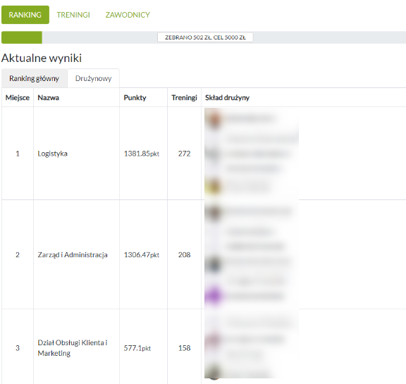 Jak widać na obrazku obok, otrzymujemy automatycznie wygenerowany ranking, gdzie wyniki osób które dołączyły do zespołów są zsuomwane oraz przeliczane na kwotę na pasku postępu. Możemy dowolnie przeliczać kilometry na punkty w zależności od dyscyplin, a także same punkty na kwotę, która ustawiamy jako cel rywalizacji.