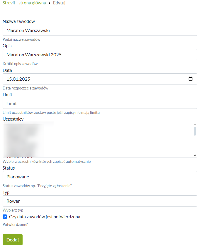 W zakładce Zawody sportowe możemy dodawać wydarzenia i kategoryzować je w zależności od typu (Rower, Bieganie, Chodzenie). Możliwe jest limitowanie ilości osób, ustawianie daty, potwierdzanie daty oraz wysyłanie do uczestników powiadomień.