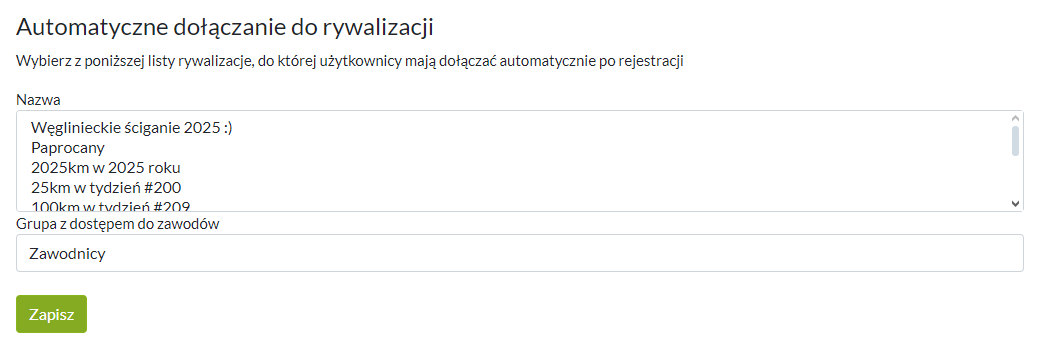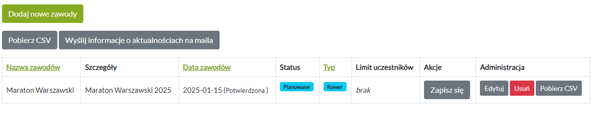 Moduł zawodów pozwala na utworzenie specjalnej grupy użytkowników, którzy mają dostęp do zakładki "Zawody sportowe", w której manager systemu może dodać wydarzenia sportowe(biegi, maratony rowerowe).