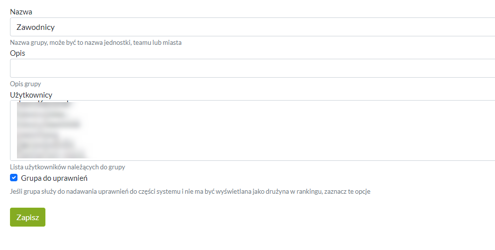W pierwszym kroku w zakładce Użytkownicy należy utworzyć nową grupę, do której przypiszemy użytkowników którzy mają mieć dostęp do zakładki z zawodami. Może być to np. "Kadra".